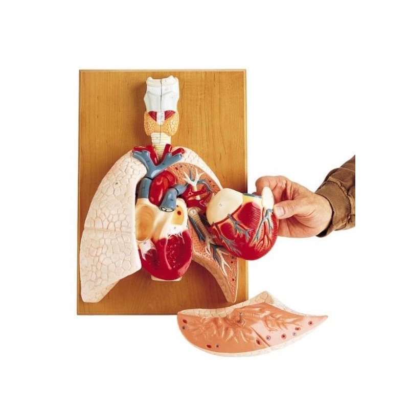 Este modelo de tamaño natural incluye pulmones, tráquea, corazón, esófago y laringe completa con cuerdas vocales. La mitad derecha de la laringe puede ser eliminado, así como el corazón y la mitad del pulmón izquierdo, lo que expone la bifurcación de la tráquea y del árbol bronquial, las arterias y venas pulmonares. El corazón se divide en mitades para mostrar sus cuatro cámaras y válvulas Circulación puede ser observada con vasos importantes de la circulación sistémica, la sangre a través de todo el cuerpo puede ser demostrada. 58 estructuras numeradas son Identificados. Tamaño: 43 x 28 x 15 cm